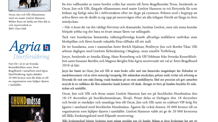 En trio vallhundar av rasen border collie har utsetts till Årets Bragdhundar. Trion, bestående av Oscar, Jim och Ulli, fångade tillsammans med matte Liselott Hansson in två förrymda får som befann sig farligt nära E6 i Arlövstrakten efter tre dygn på rymmen. Polisen stod i begrepp att avliva fåren om de skulle ta sig upp på motorvägen efter att alla tidigare försök att fånga in dem misslyckats.