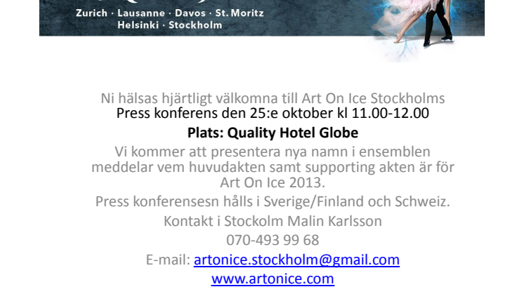 Ni hälsas hjärtligt välkomna till konståkningsshowen Art On Ice Stockholms presskonferens torsdag den 25:e oktober kl 11.00-12.00