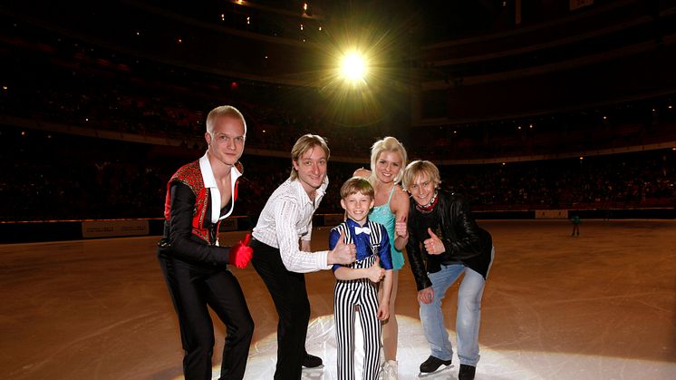 Bildtext: Evgeny Plushenko (vit skjorta) med de svenska deltagarna på Stockholm Ice 2010 (fr v): Adrian Schultheiss, Nikolaj Majorov (9 år), Viktoria Helgesson och Kristoffer Berntsson.