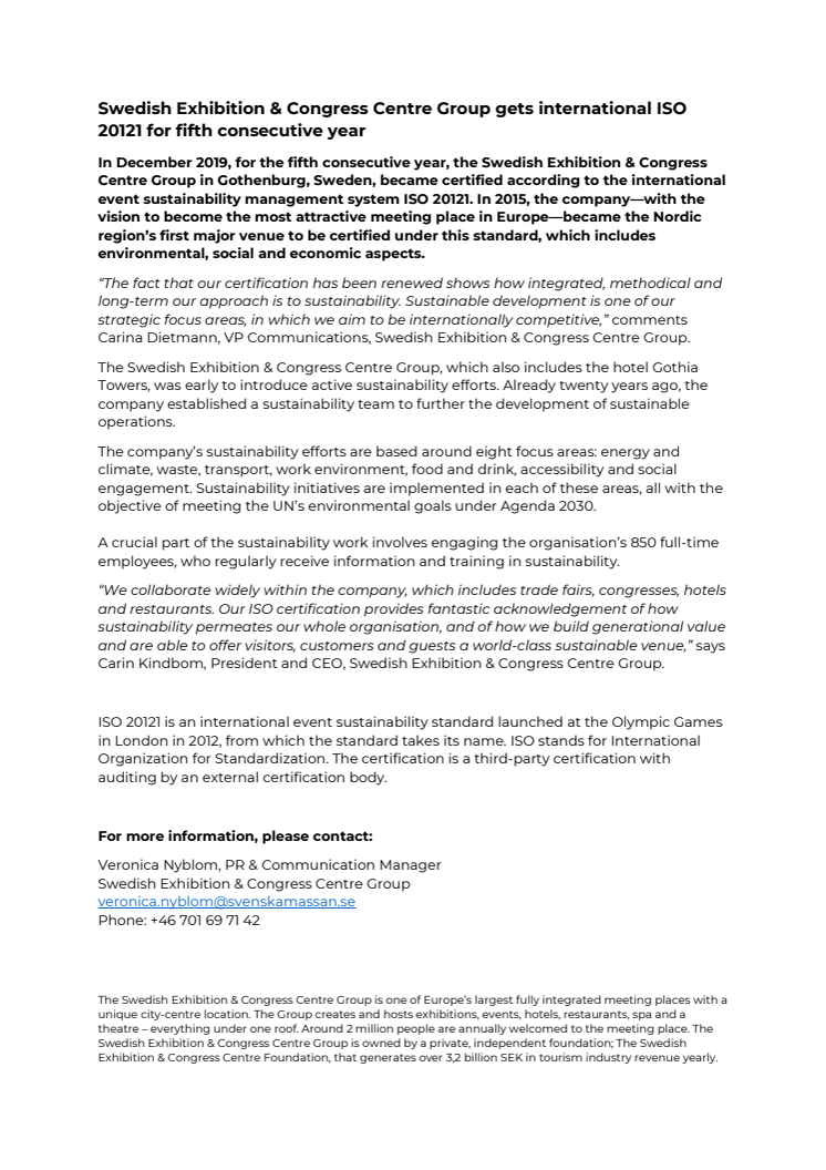 In December 2019, for the fifth consecutive year, the Swedish Exhibition & Congress Centre Group in Gothenburg, Sweden, became certified according to the international event sustainability management system ISO 20121. In 2015, the company became the Nordic region’s first major venue to be certified under this standard, which includes environmental, social and economic aspects.