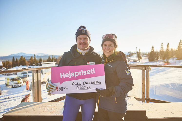 Telemarkåkaren Olle Collberg tilldelas Svenska Spels Hejappris. Här tillsammans med Cecilia Norberg, styrelseledamot Svenska Skidförbundet.