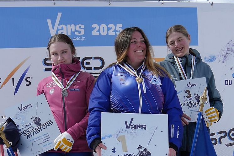 Prispallen under JVM i speedski 2025. Fr.v. Amanda Ribbegårdh, Pauline Sabatut (FRA) och Villemo Andersson.