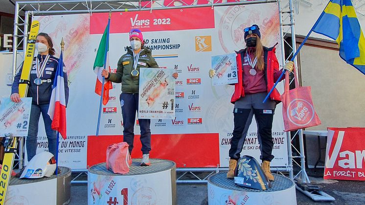 Damernas prispall VM, fr.v. silver Clea Martinez (FRA), guld Valentina Greggio (ITA) och brons Britta Backlund.