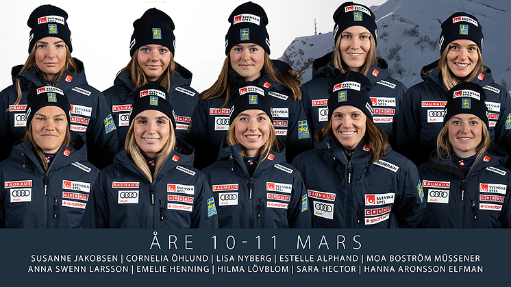 Anna Swenn Larsson, Sara Hector, Hanna Aronsson Elfman, Estelle Alphand, Hilma Lövblom, Lisa Nyberg, Susanne Jakobsen, Emelie Henning, Moa Boström Müssener och Cornelia Öhlund utgör laget till världscupen på hemmaplan 10-11 mars. För Susanne Jakobsen från Storklintens alpina innebär tävlingarna i Åre världscupdebut. 23-åringen gjorde sin debut i Europacupen i Berchtesgaden 2021 och tog personbästa med en fjärdeplats i slalomen i Vaujany i januari.