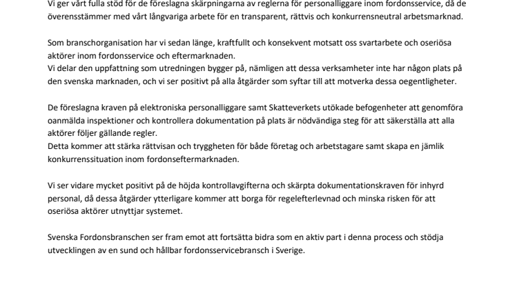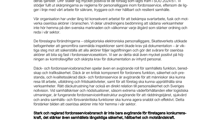 Svenska Fordonsbranschen och Däckspecialisternas Riksförbund (DRF) ställer sig bakom Finansdepartementets förslag att stärka kontrollmöjligheterna inom fordonseftermarknaden. Åtgärder som obligatoriska elektroniska personalliggare, utökade kontroller från Skatteverket och skärpta dokumentationskrav är viktiga steg mot att skapa en rättvis och transparent arbetsmarknad.
