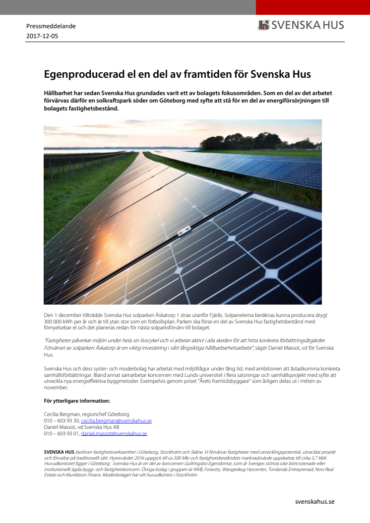 Hållbarhet har sedan Svenska Hus grundades varit ett av bolagets fokusområden. Som en del av det arbetet förvärvas därför en solkraftspark söder om Göteborg med syfte att stå för en del av energiförsörjningen till bolagets fastighetsbestånd.