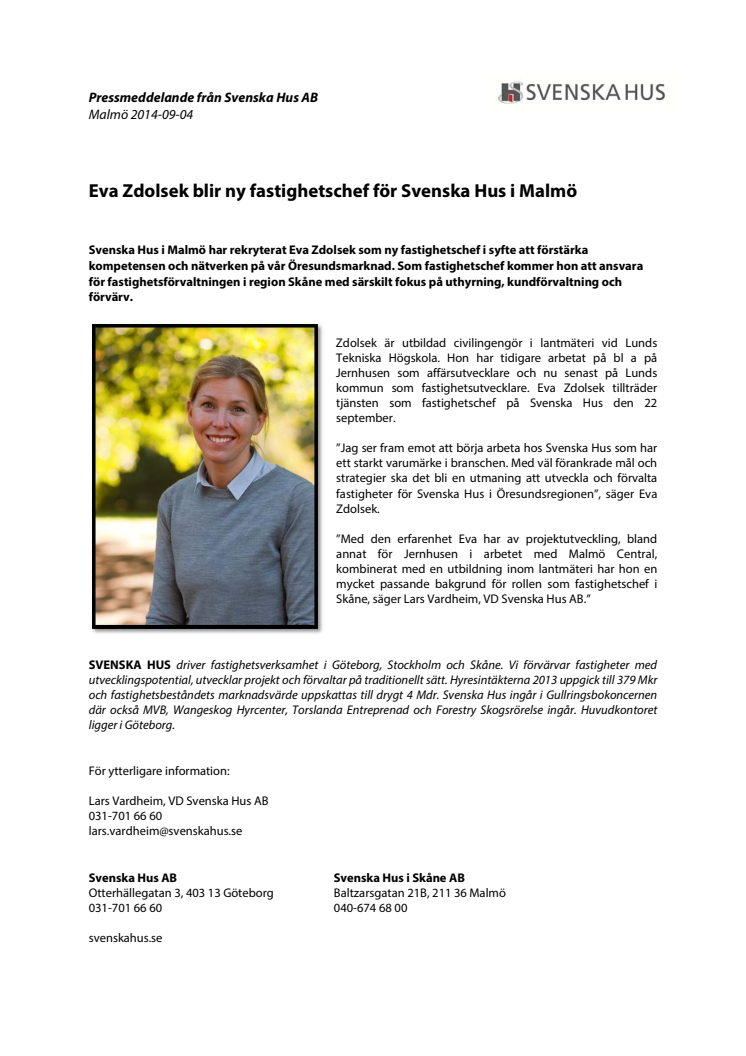 Svenska Hus i Malmö har rekryterat Eva Zdolsek som ny fastighetschef i syfte att förstärka kompetensen och nätverken på vår Öresundsmarknad. Som fastighetschef kommer hon att ansvara för fastighetsförvaltningen i region Skåne med särskilt fokus på uthyrning, kundförvaltning och förvärv.