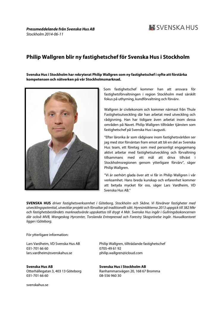 Svenska Hus i Stockholm har rekryterat Philip Wallgren som ny fastighetschef i syfte att förstärka kompetensen och nätverken på vår Stockholmsmarknad. Som fastighetschef kommer Philip ansvara för fastighets-förvaltningen i region Stockholm med särskilt fokus på uthyrning, kundförvaltning och förvärv.