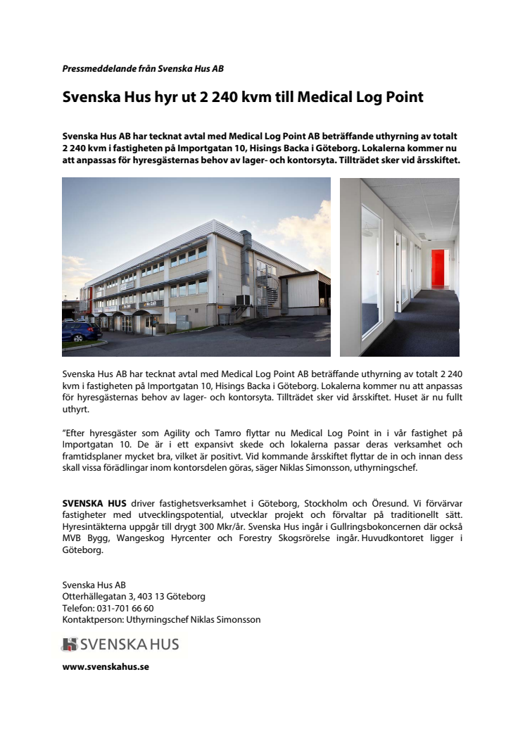 Svenska Hus AB har tecknat avtal med Medical Log Point AB beträffande uthyrning av totalt 2 240 kvm i fastigheten på Importgatan 10, Hisings Backa i Göteborg. Lokalerna kommer nu att anpassas för hyresgästernas behov av lager- och kontorsyta. Tillträdet sker vid årsskiftet.