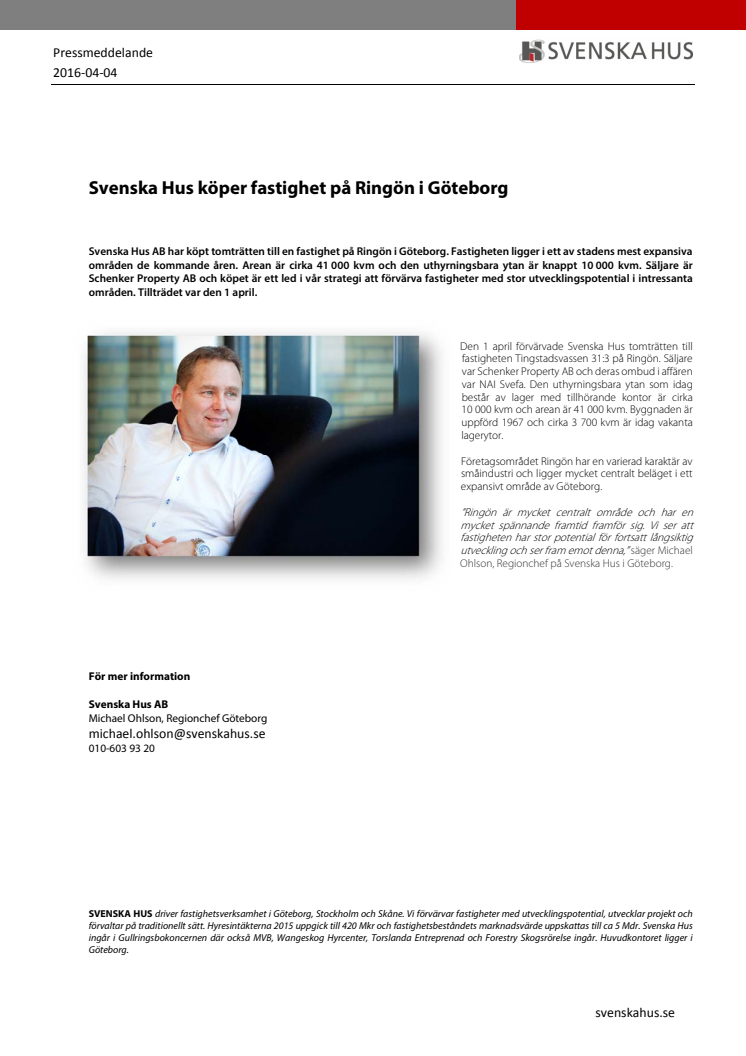 Svenska Hus AB har köpt tomträtten till en fastighet på Ringön i Göteborg. Fastigheten ligger i ett av stadens mest expansiva områden de kommande åren. Arean är cirka 41 000 kvm och den uthyrningsbara ytan är knappt 10 000 kvm. Säljare är Schenker Property AB och köpet är ett led i vår strategi att förvärva fastigheter med utvecklingspotential i intressanta områden. Tillträdet var den 1 april.