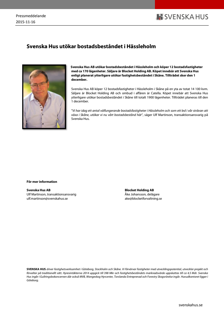 Svenska Hus AB utökar bostadsbeståndet i Hässleholm och köper 12 bostadsfastigheter med ca 170 lägenheter. Säljare är Blocket Holding AB. Köpet innebär att Svenska Hus enligt planerat ytterligare utökar fastighetsbeståndet i Skåne till totalt ca 1900 lägenheter. Tillträdet sker den 1 december.