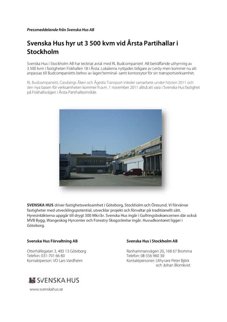 Svenska Hus hyr ut 3 500 kvm vid Årsta Partihallar i Stockholm. Svenska Hus i Stockholm AB har tecknat avtal med RL Budcompaniett AB beträffande uthyrning av 3 500 kvm i fastigheten Fiskhallen 18 i Årsta. RL Budcompaniett, Cassbergs Åkeri och Ågesta Transport inleder samarbete och den nya basen för transportverksamheten kommer fr o m 1 november 2011 att vara i dessa lokaler.
