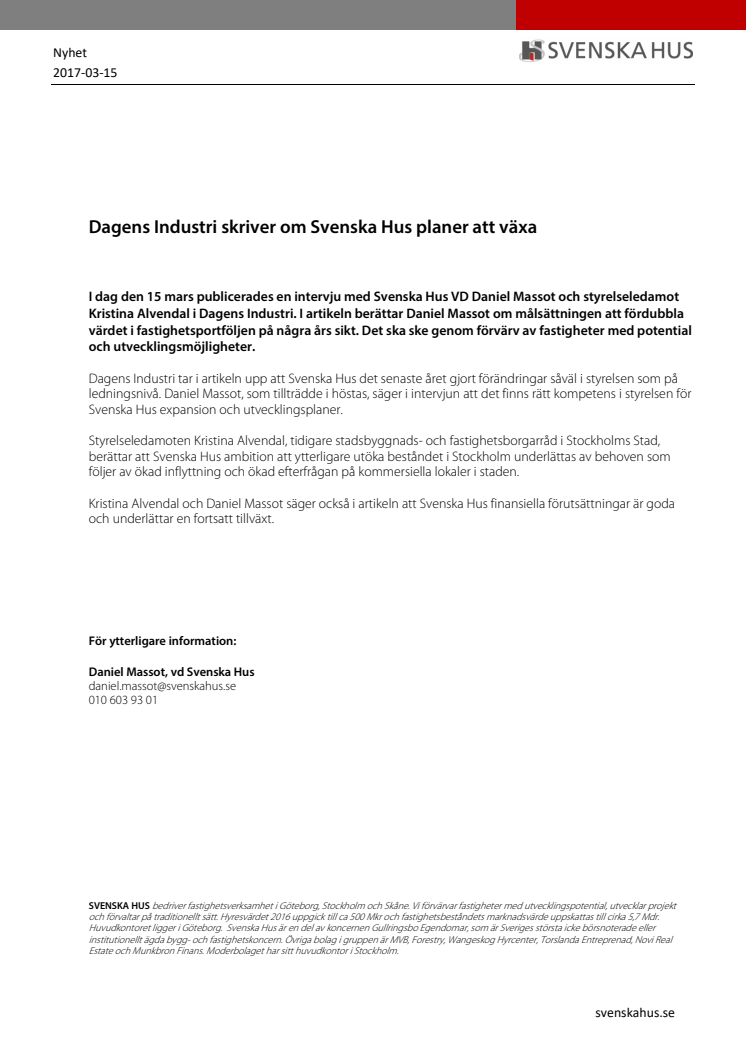 I dag den 15 mars publiceras en intervju med Svenska Hus VD Daniel Massot och styrelseledamot Kristina Alvendal i Dagens Industri. I artikeln berättar Daniel Massot om målsättningen att fördubbla värdet i fastighetsportföljen på några års sikt. Det ska ske genom förvärv av fastigheter med potential och utvecklingsmöjligheter.