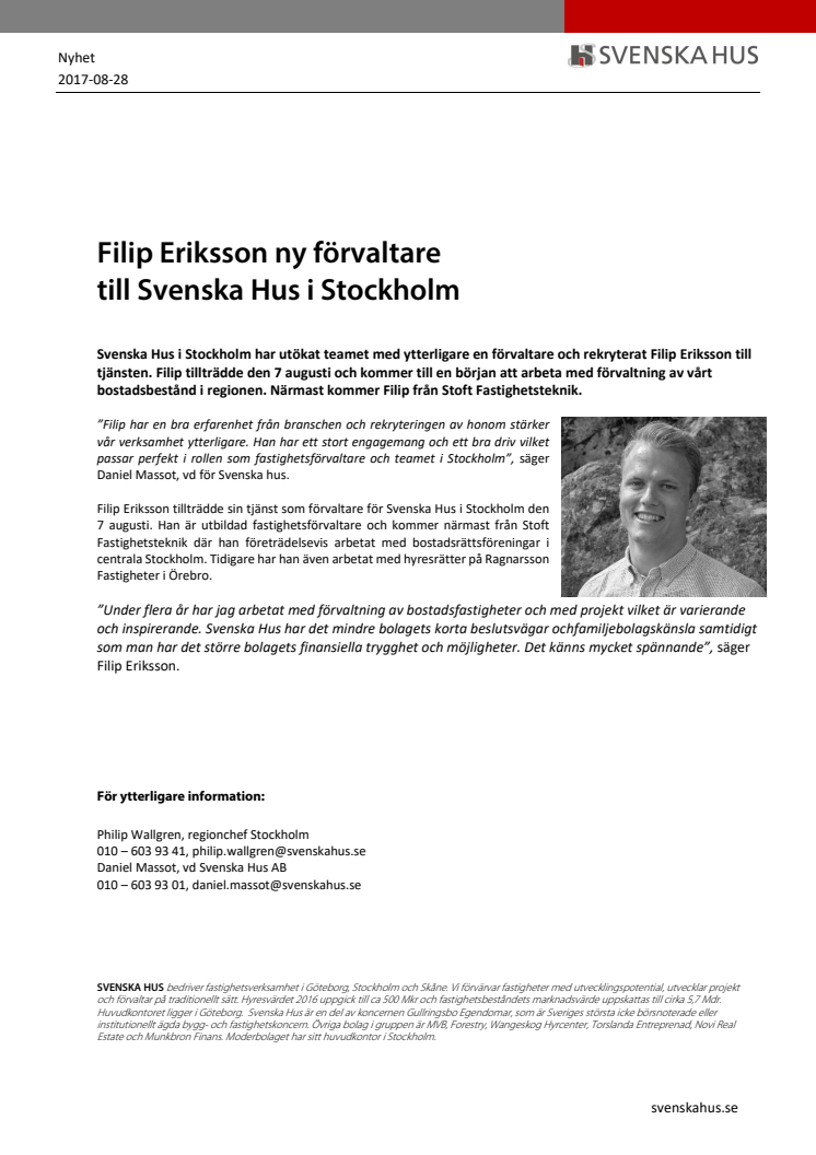 Filip Eriksson tillträdde sin tjänst som förvaltare för Svenska Hus i Stockholm den 7 augusti. Han är utbildad fastighetsförvaltare och kommer närmast från Stoft Fastighetsteknik där han företrädelsevis arbetat med bostadsrättsföreningar i centrala Stockholm. Tidigare har han även arbetat med hyresrätter på Ragnarsson Fastigheter i Örebro.