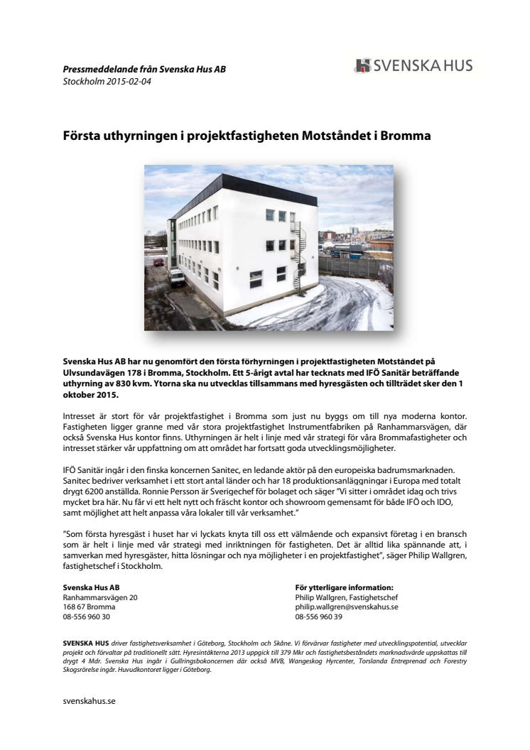 Svenska Hus AB har nu genomfört den första förhyrningen i projektfastigheten Motståndet på Ulvsundavägen 178 i Bromma, Stockholm. Ett 5-årigt avtal har tecknats med IFÖ Sanitär beträffande uthyrning av 830 kvm. Ytorna ska nu utvecklas tillsammans med hyresgästen och tillträdet sker den 1 oktober 2015.