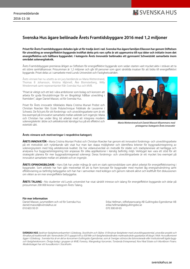Svenska Hus ägare belönade Årets Framtidsbyggare 2016 med 1,2 miljoner