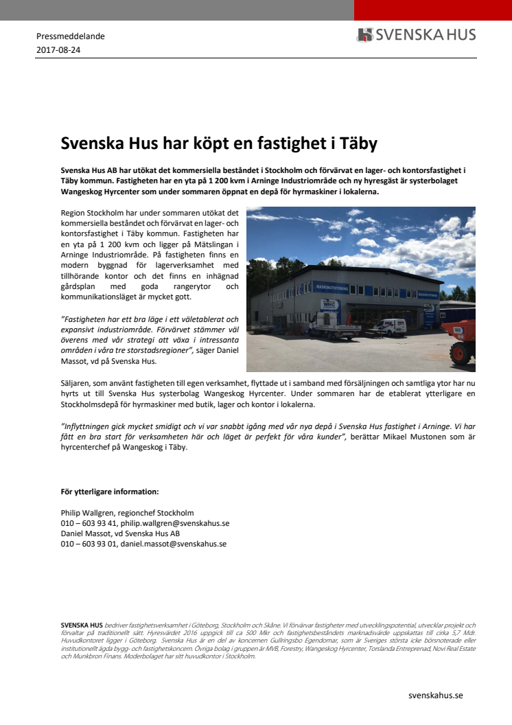 ”Fastigheten har ett bra läge i ett väletablerat och expansivt industriområde. Förvärvet stämmer väl överens med vår strategi att växa i intressanta områden i våra tre storstadsregioner”, säger Daniel Massot, vd på Svenska Hus.