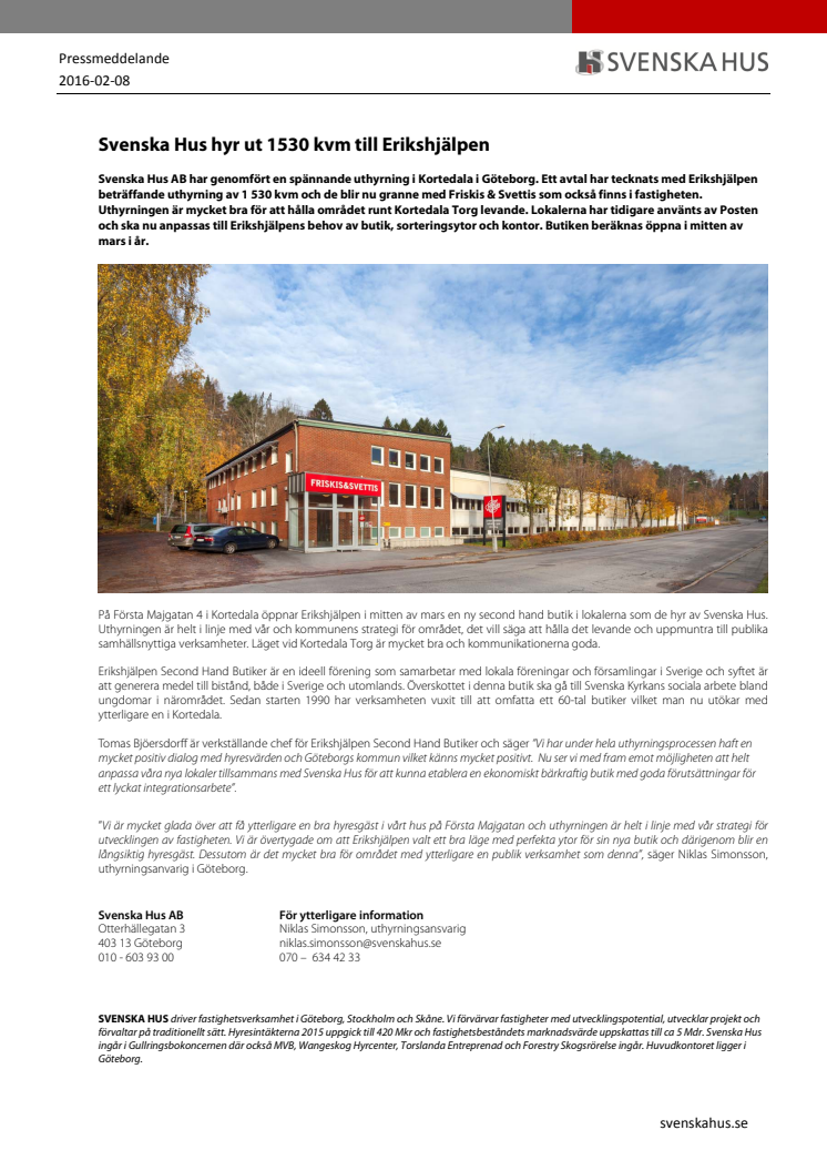 Tomas Bjöersdorff är verkställande chef för Erikshjälpen Second Hand Butiker och säger ”Vi har under hela uthyrningsprocessen haft en mycket positiv dialog med hyresvärden och Göteborgs kommun vilket känns mycket positivt. Nu ser vi med fram emot möjligheten att helt anpassa våra nya lokaler tillsammans med Svenska Hus för att kunna etablera en ekonomiskt bärkraftig butik med goda förutsättningar för ett lyckat integrationsarbete”.
