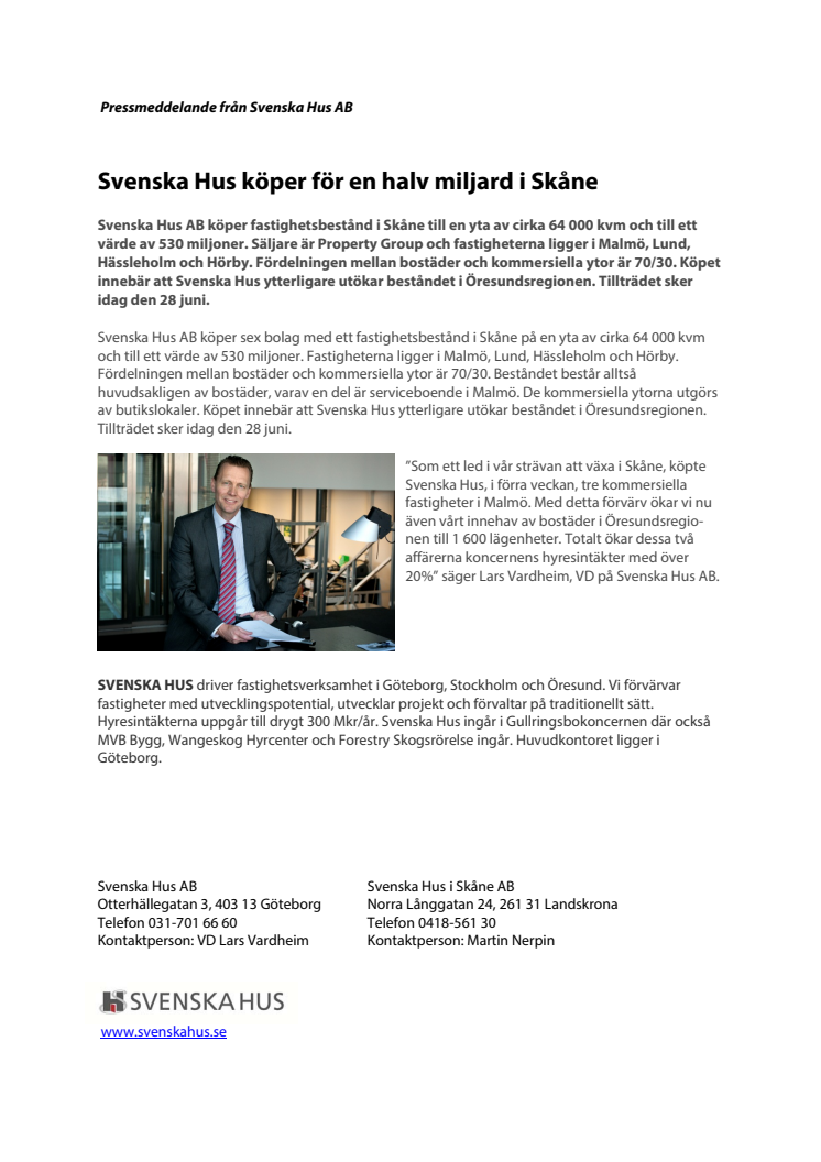 ”Som ett led i vår strävan att växa i Skåne, köpte Svenska Hus, i förra veckan, tre kommersiella fastigheter i Malmö. Med detta förvärv ökar vi nu även vårt innehav av bostäder i Öresundsregionen till 1 600 lägenheter. Totalt ökar dessa två affärerna koncernens hyresintäkter med över 20%” säger Lars Vardheim, VD på Svenska Hus AB.
