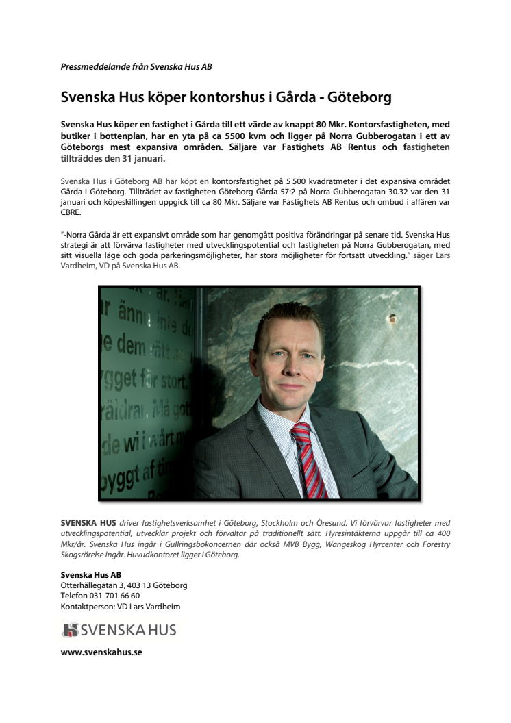 ”-Norra Gårda är ett expansivt område som har genomgått positiva förändringar på senare tid. Svenska Hus strategi är att förvärva fastigheter med utvecklingspotential och fastigheten på Norra Gubberogatan, med sitt visuella läge och goda parkeringsmöjligheter, har stora möjligheter för fortsatt utveckling.” säger Lars Vardheim, VD på Svenska Hus AB.
