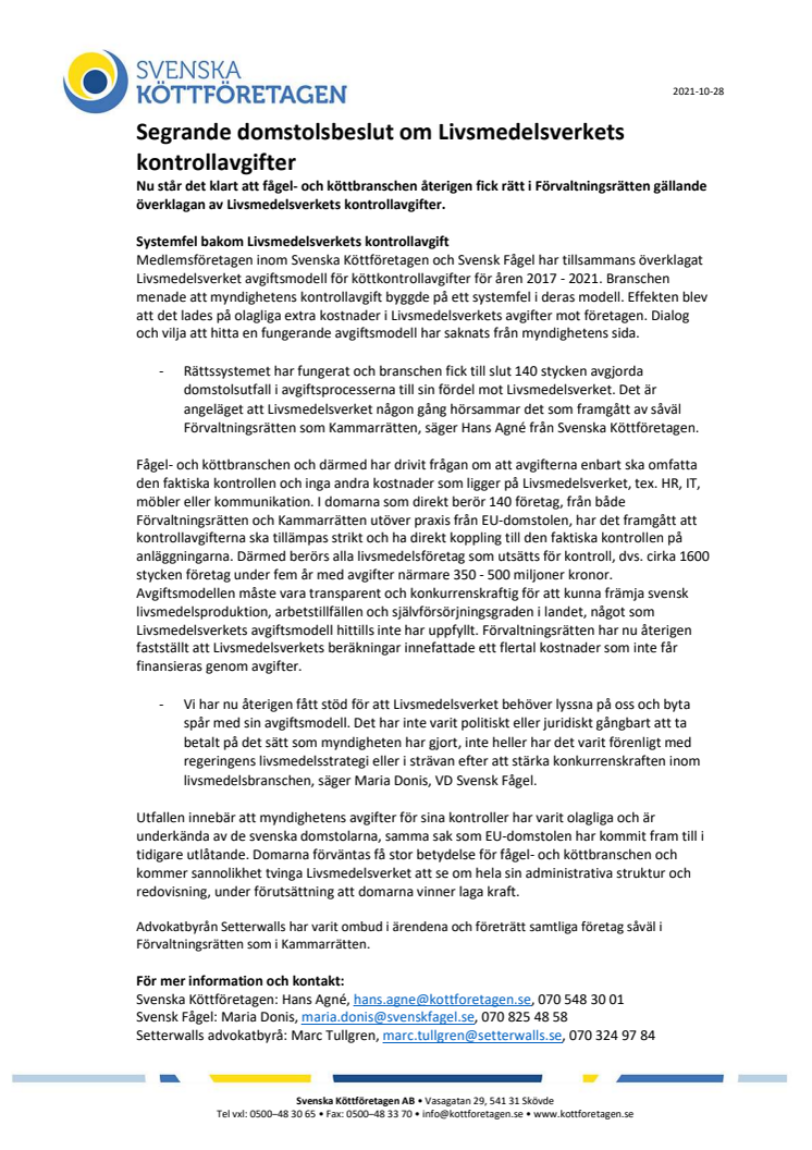 • Pressmeddelande: Segrande domstolsbeslut om Livsmedelsverkets kontrollavgifter