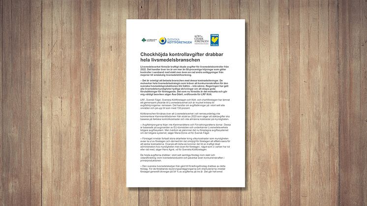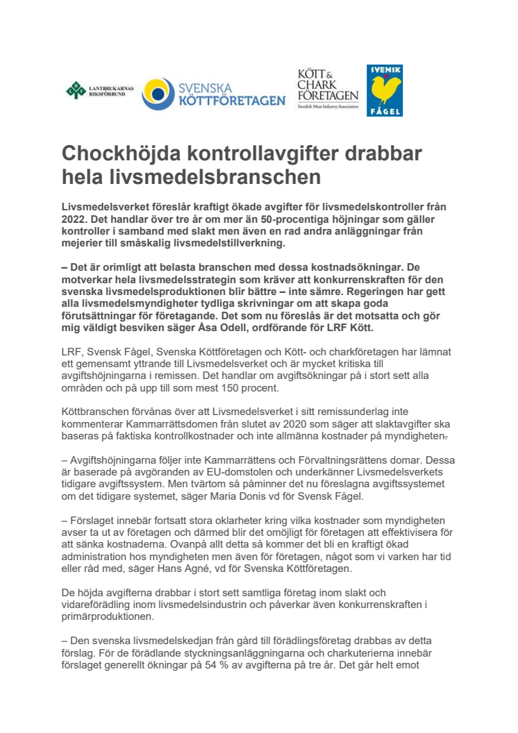 LRF, Svensk Fågel, Svenska Köttföretagen och Kött- och charkföretagen har lämnat ett gemensamt yttrande till Livsmedelsverket och är mycket kritiska till avgiftshöjningarna i remissen. Det handlar om avgiftsökningar på i stort sett alla områden och på upp till som mest 150 procent.
