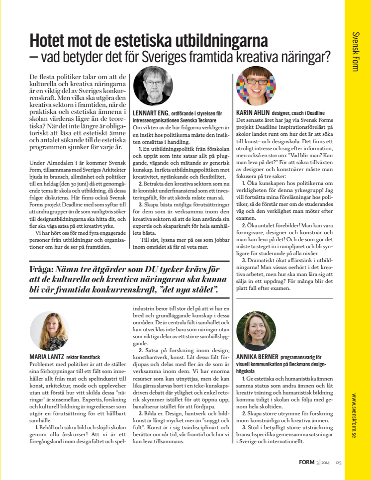 Svensk Forms artikel i tidningen Form #3 2014, med korta intervjuer med inflytelserika personer kring frågan om vilka åtgärder som krävs för att de kulturella och kreativa näringarna ska kunna bli vår framtida konkurrenskraft, ”det nya stålet”. Vilka ska utgöra den kreativa sektorn i framtiden, när de praktiska och estetiska ämnena i skolan värderas lägre än de teoretiska?