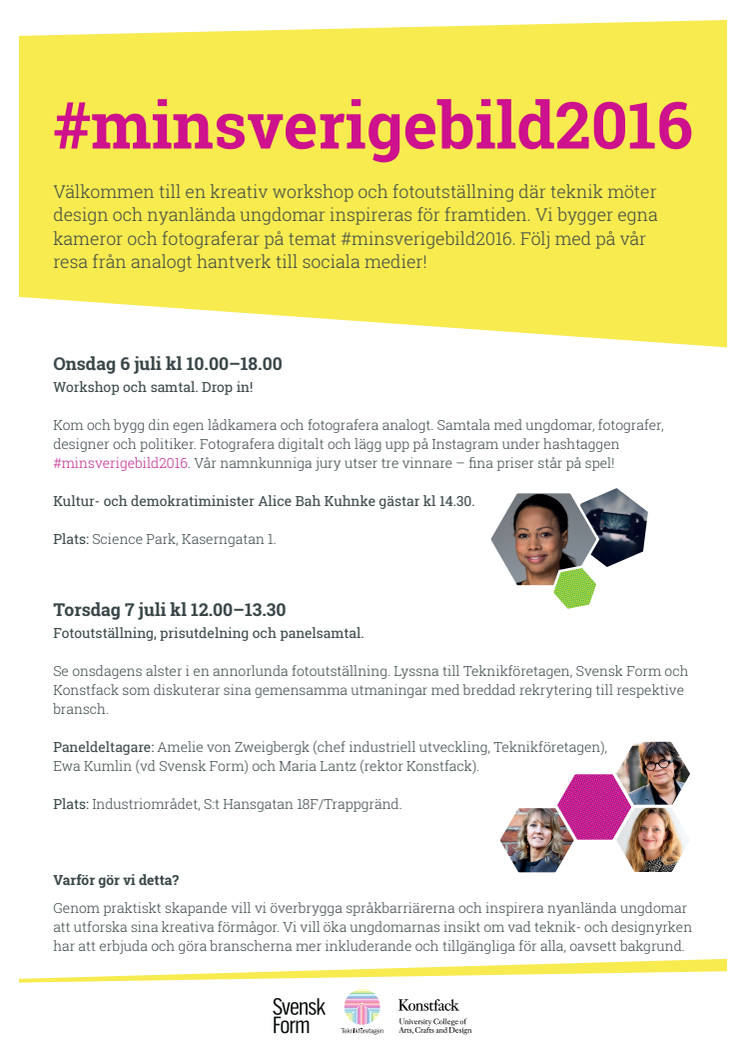 Fotografierna visas i en utställning och tre vinnare utses av en jury. I anslutning till detta diskuterar Teknikföretagen, Svensk Form och Konstfack de gemensamma utmaningarna som Sverige står inför vad det gäller kompetensförsörjning och mångfald på arbetsmarknaden. Vi vill öka ungdomarnas insikt om vad teknik- och designyrken har att erbjuda och göra branscherna mer inkluderande och tillgängliga för alla, oavsett bakgrund.