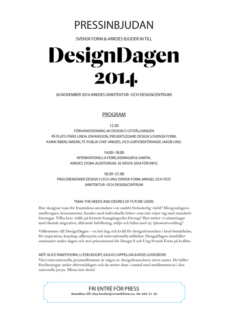 DesignDagen 2014 hålls den 26 november och är en hel dag och kväll som riktar sig till designbranschen i bred bemärkelse. En berikande kunskapsdag som ger nya infallsvinklar, inspiration och uppslag för affärsnytta. I seminarier och samtal inbjuder vi till diskussion om framtidens utmaningar och lösningar inom designvärlden. Dagen avslutas med prisutdelning och mingel då vi firar pristagare och nominerade i Design S och Ung Svensk Form.