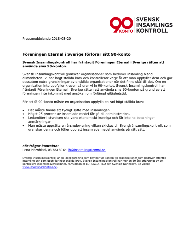 Svensk Insamlingskontroll har fråntagit Föreningen Eternal i Sverige rätten att använda sina 90-konton.