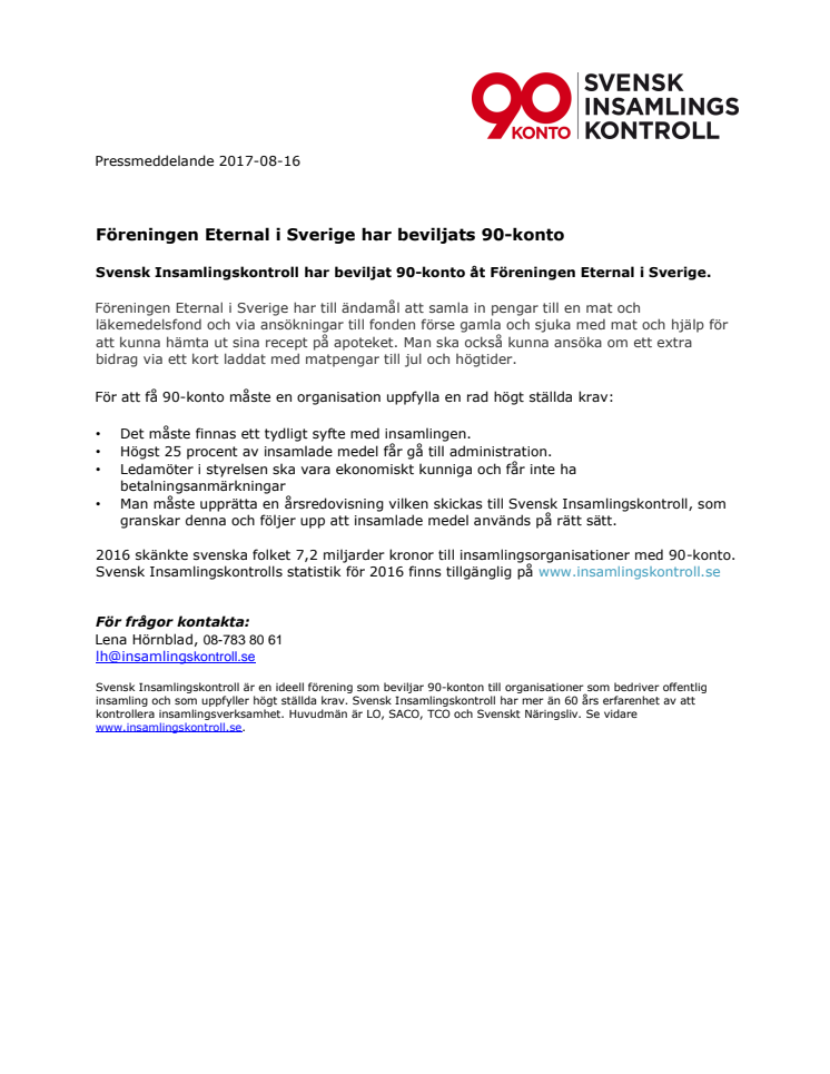 Svensk Insamlingskontroll har beviljat 90-konto åt Föreningen Eternal i Sverige.