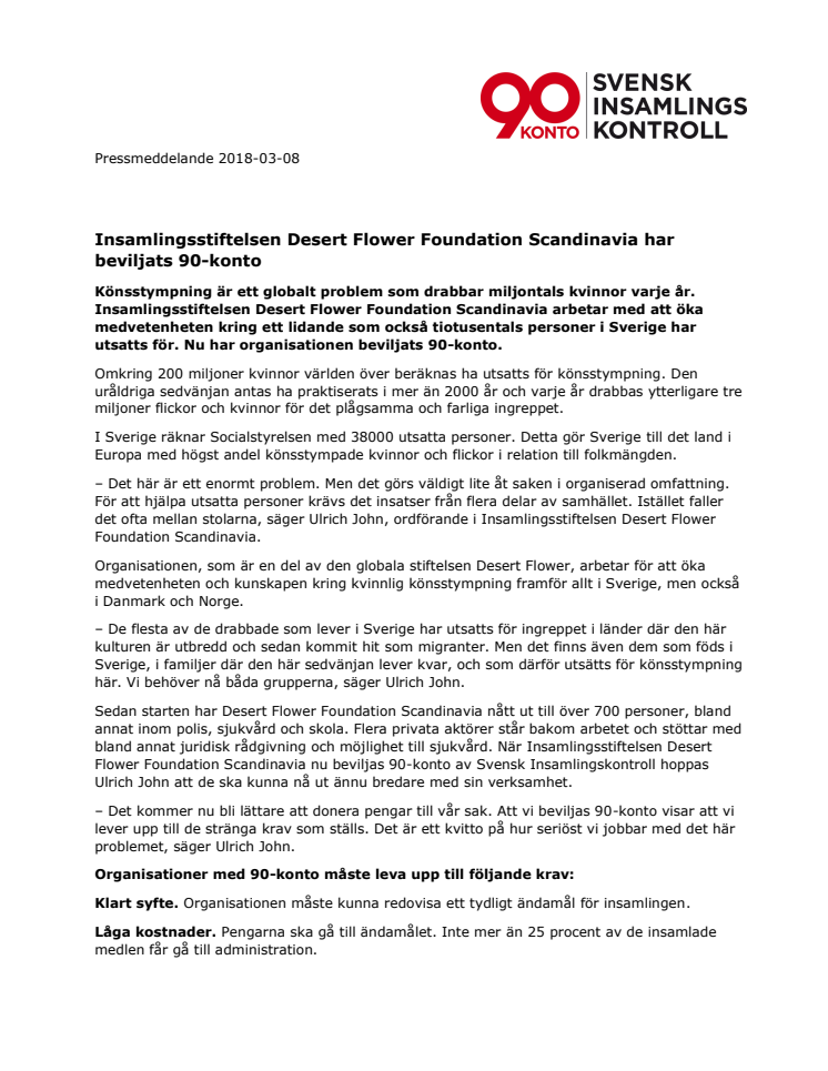 Könsstympning är ett globalt problem som drabbar miljontals kvinnor varje år. Insamlingsstiftelsen Desert Flower Foundation Scandinavia arbetar med att öka medvetenheten kring ett lidande som också tiotusentals personer i Sverige har utsatts för. Nu har organisationen beviljats 90-konto.
