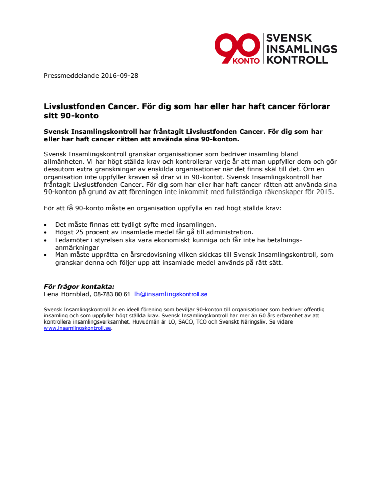 Svensk Insamlingskontroll har fråntagit Livslustfonden Cancer. För dig som har eller har haft cancer rätten att använda sina 90-konton.