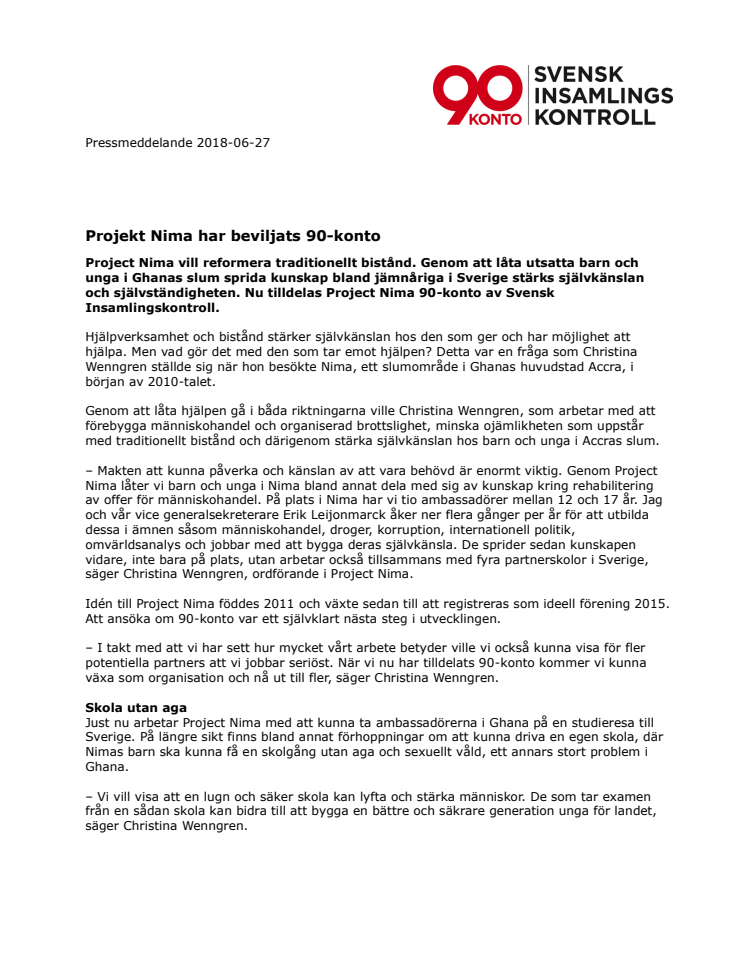 Project Nima vill reformera traditionellt bistånd. Genom att låta utsatta barn och unga i Ghanas slum sprida kunskap bland jämnåriga i Sverige stärks självkänslan och självständigheten. Nu tilldelas Project Nima 90-konto av Svensk Insamlingskontroll.