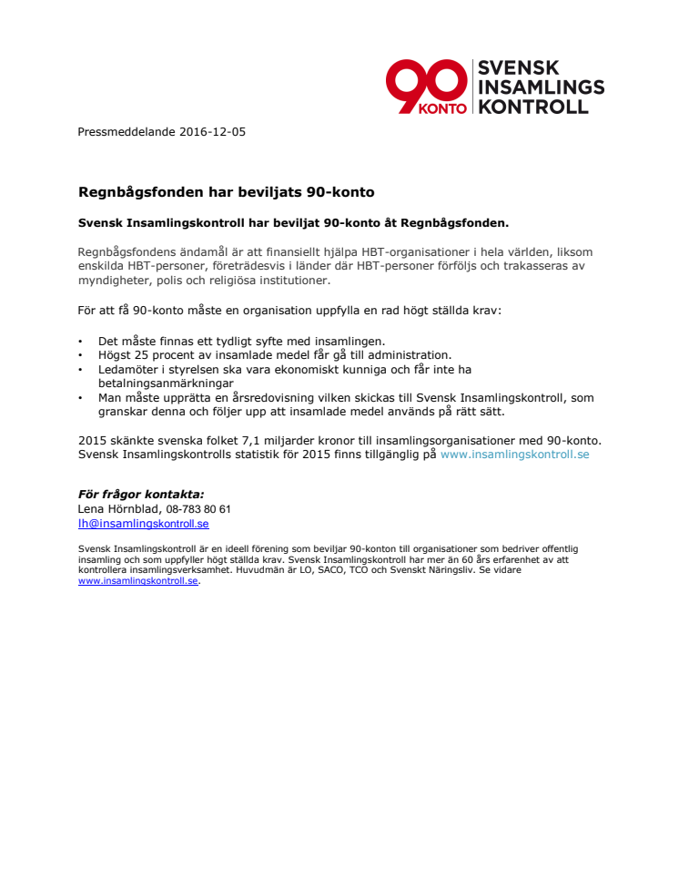 Svensk Insamlingskontroll har beviljat 90-konto åt Regnbågsfonden.