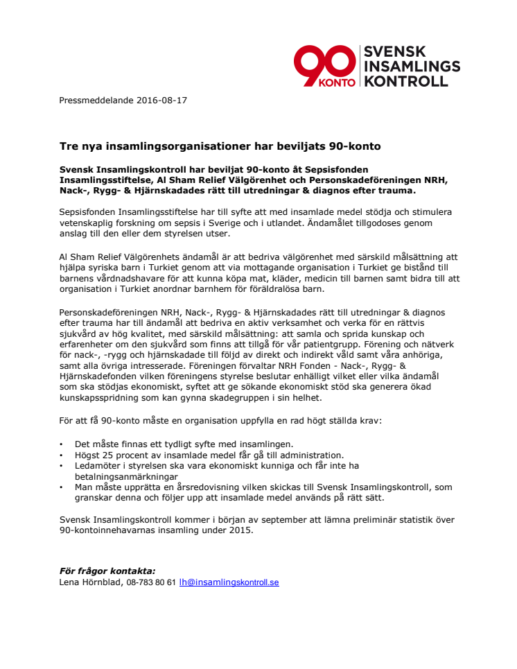 Svensk Insamlingskontroll har beviljat 90-konto åt Sepsisfonden Insamlingsstiftelse, Al Sham Relief Välgörenhet och Personskadeföreningen NRH, Nack-, Rygg- & Hjärnskadades rätt till utredningar & diagnos efter trauma.