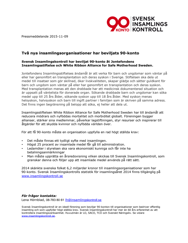 Svensk Insamlingskontroll har beviljat 90-konto åt Jontefondens Insamlingsstiftelse och White Ribbon Alliance for Safe Motherhood Sweden.