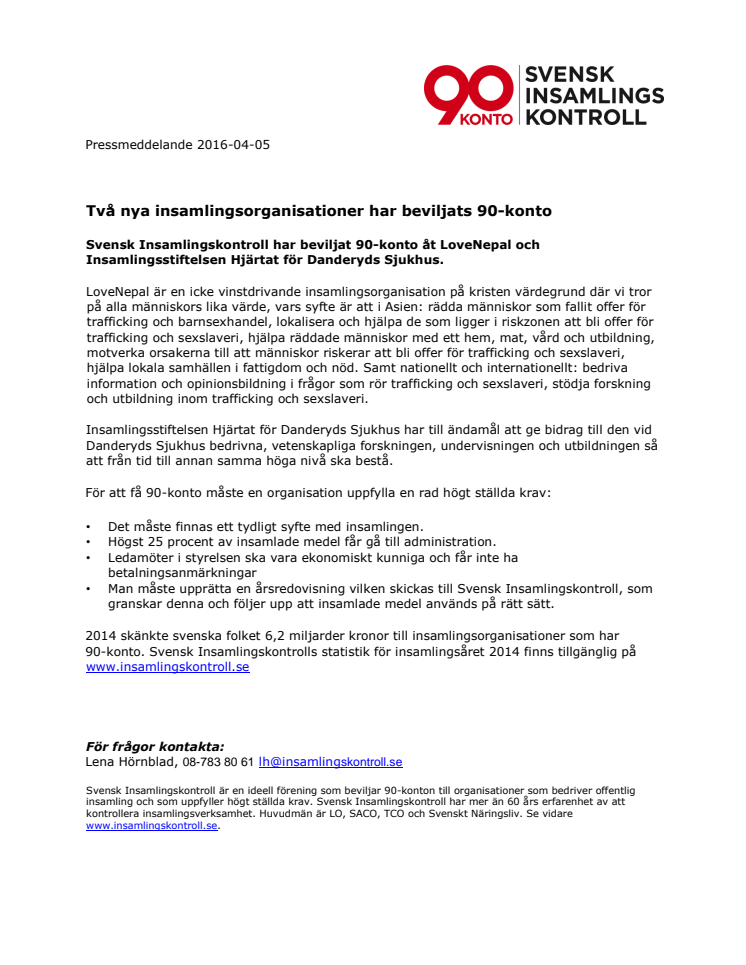 Svensk Insamlingskontroll har beviljat 90-konto åt LoveNepal och Insamlingsstiftelsen Hjärtat för Danderyds Sjukhus.