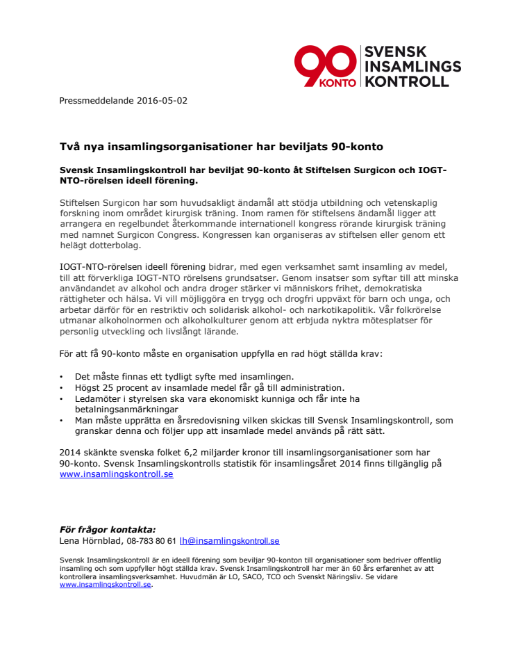 Svensk Insamlingskontroll har beviljat 90-konto åt Stiftelsen Surgicon och IOGT-NTO-rörelsen ideell förening.
