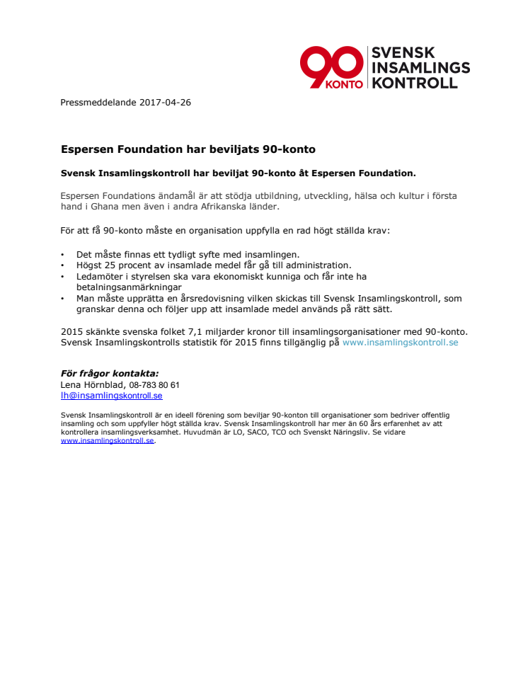 Svensk Insamlingskontroll har beviljat 90-konto åt Espersen Foundation och Ung Cancer.