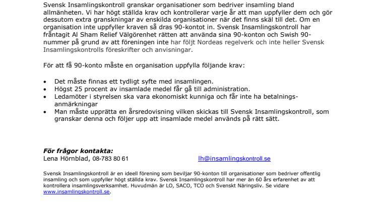 Svensk Insamlingskontroll granskar organisationer som bedriver insamling bland allmänheten. Vi har högt ställda krav och kontrollerar varje år att man uppfyller dem och gör dessutom extra granskningar av enskilda organisationer när det finns skäl till det. Om en organisation inte uppfyller kraven så dras 90-kontot in. Svensk Insamlingskontroll har fråntagit Al Sham Relief Välgörenhet rätten att använda sina 90-konton och Swish 90-nummer på grund av att föreningen inte har följt Nordeas regelverk och inte heller Svensk Insamlingskontrolls föreskrifter och anvisningar.