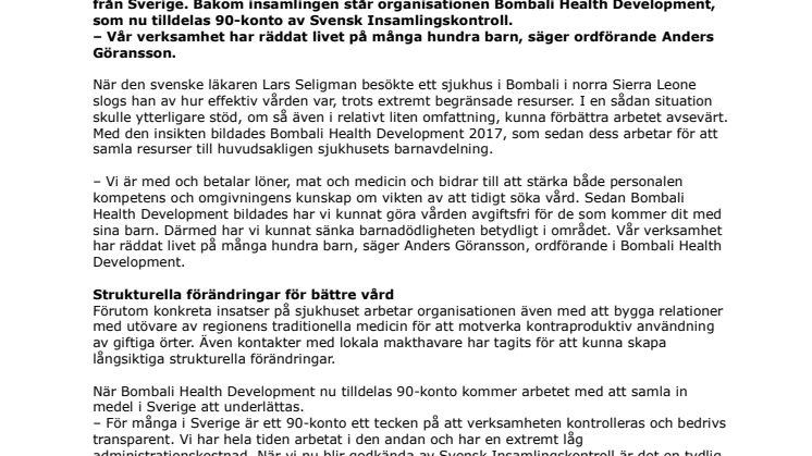 När Bombali Health Development nu tilldelas 90-konto kommer arbetet med att samla in medel i Sverige att underlättas.