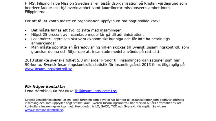 Svensk Insamlingskontroll har beviljat 90-konto åt FTMS, Filipino Tribe Mission Sweden.