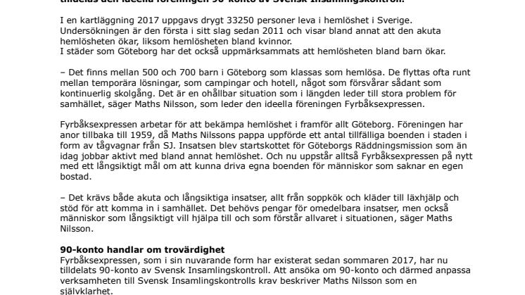 Allt fler personer lever i akut hemlöshet, enligt Socialstyrelsen. Fyrbåksexpressen i Göteborg vill bekämpa utvecklingen bland annat genom att öppna egna boenden. Nu tilldelas den ideella föreningen 90-konto av Svensk Insamlingskontroll.