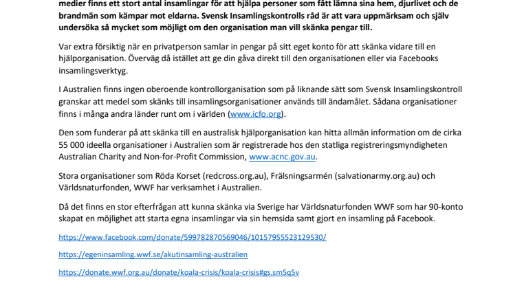 Nyhetsrapporterna om skogsbränderna i Australien berör många människor världen över och i sociala medier finns ett stort antal insamlingar för att hjälpa personer som fått lämna sina hem, djurlivet och de brandmän som kämpar mot eldarna. Svensk Insamlingskontrolls råd är att vara uppmärksam och själv undersöka så mycket som möjligt om den organisation man vill skänka pengar till.