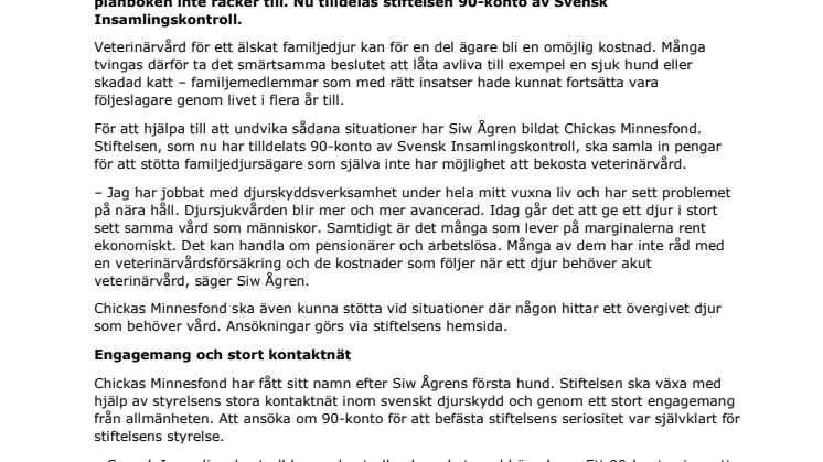 För att hjälpa till att undvika sådana situationer har Siw Ågren bildat Chickas Minnesfond. Stiftelsen, som nu har tilldelats 90-konto av Svensk Insamlingskontroll, ska samla in pengar för att stötta familjedjursägare som själva inte har möjlighet att bekosta veterinärvård.