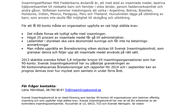 Svensk Insamlingskontroll har beviljat 90-konto åt Insamlingsstiftelsen Mitt Fadderbarn.