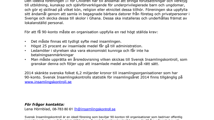 Svensk Insamlingskontroll har beviljat 90-konto åt IT for Children.