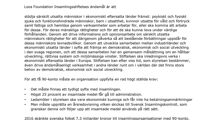Svensk Insamlingskontroll har beviljat 90-konto åt Loza foundation Insamlingsstiftelse.