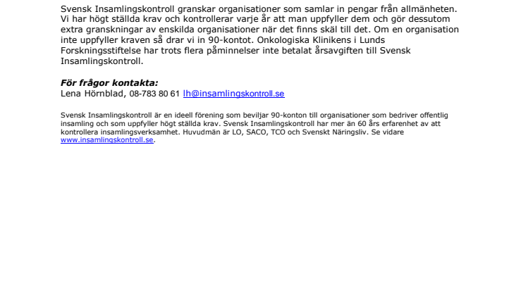 Svensk Insamlingskontroll granskar organisationer som samlar in pengar från allmänheten. Vi har högt ställda krav och kontrollerar varje år att man uppfyller dem och gör dessutom extra granskningar av enskilda organisationer när det finns skäl till det. Om en organisation inte uppfyller kraven så drar vi in 90-kontot. Onkologiska Klinikens i Lunds Forskningsstiftelse har trots flera påminnelser inte betalat årsavgiften till Svensk Insamlingskontroll.